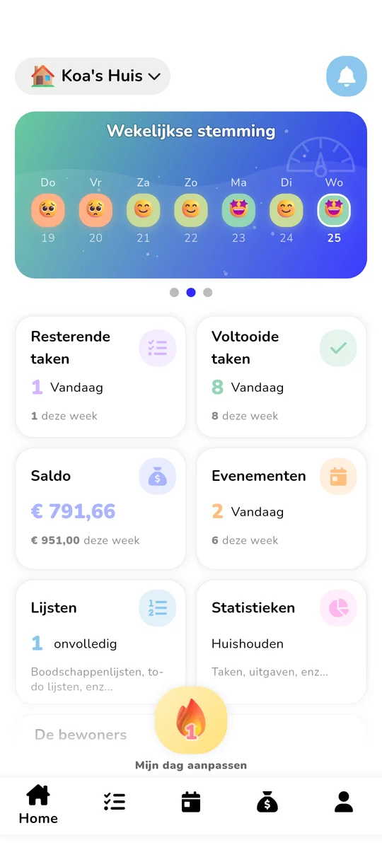 Wie doet wat? Hoeveel geeft iedereen uit? Hoe ontwikkelt de stemming zich? Een compleet dashboard om je huishouden te begrijpen.